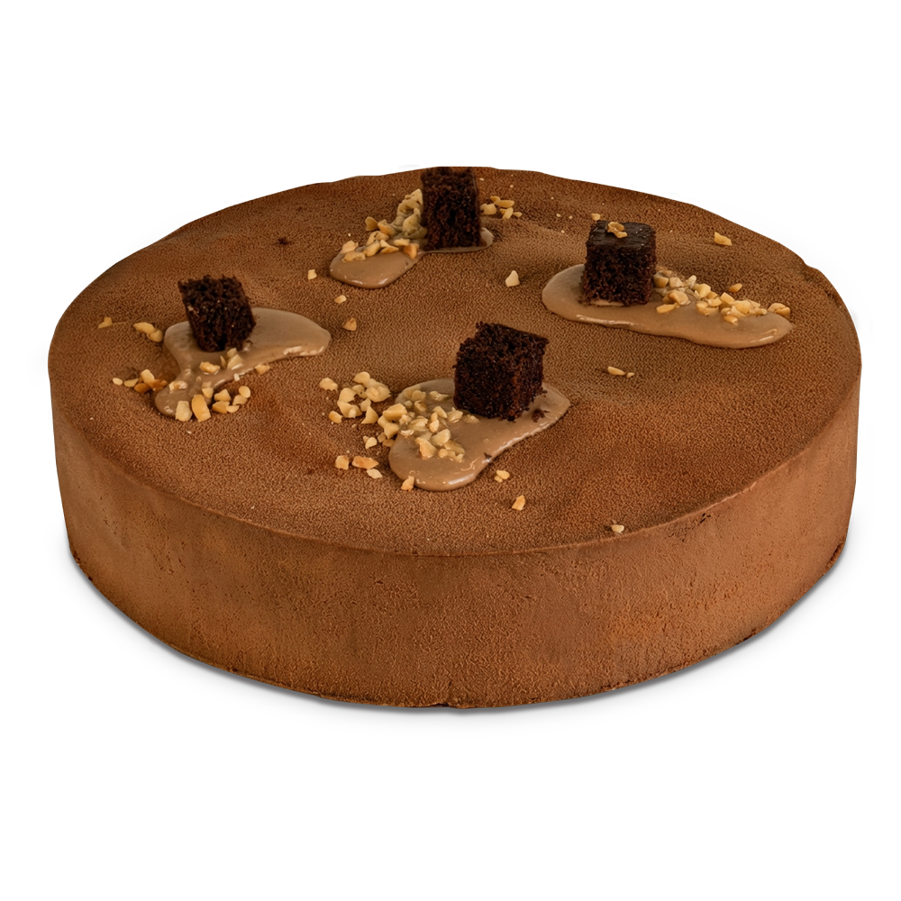 Biscuit alla nocciola con croccante di cioccolato al latte e nocciole pralinate e salate, crème caramel e glassa al caramello. Decorazione con nocciole caramellate.