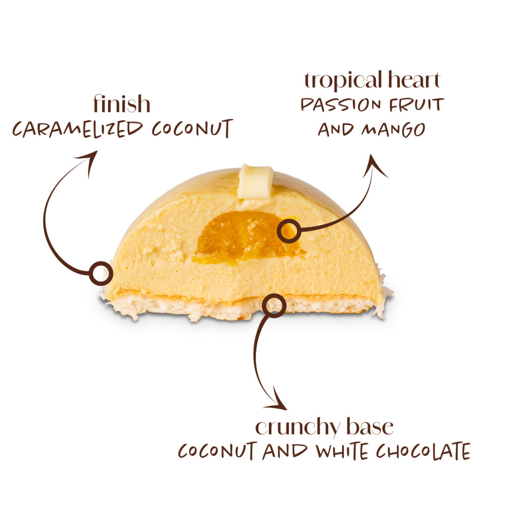 A taste experience that transports the palate on an exotic journey. The crunchy coconut and white chocolate base offers a pleasantly crumbly texture, while the tropical fruit heart, composed of juicy mango and passion fruit, delivers a burst of freshness and vibrant flavors.